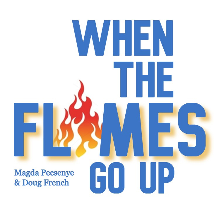 — and I got together to make When the Flames Go Up, a podcast about handling all the really adult stuff that starts slapping you around after you turn 50. We’re all dealing with something we didn’t see coming, and we hope this burgeoning “fiftypedia” becomes a library of advice and shared experience to help us all figure out our Third Acts. (Although for me, it feels like Act 8 or 9.)This is our logo, which I’m going to have to update after Magda marries a nice gentleman from Boston and takes his name: